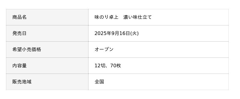 のりやごま、ふりかけ、お茶漬けの素などの製造、販売を行う株式会社浜乙女(本社:名古屋市中村区、代表取締役社長:服部義博)は、国内産海苔を使用した「味のり卓上 濃い味仕立て」を9月16日(火)より全国で販売開始をします。近年続く海苔の価格高騰により「高くて満足感がない」という声に応えるべく、独自の製法で、販売価格は抑えながらもごはんにもおつまみにも合う甘辛い濃い味に仕上げました。