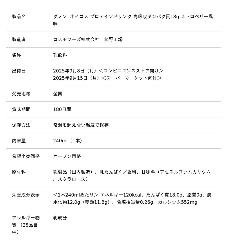 ダノンジャパン株式会社(本社:東京都目黒区、代表取締役社長:ロドリゴ・リマ、以下ダノンジャパン)は、カラダを動かすすべての人の良質なタンパク質補給を応援する「ダノン オイコス」ブランドより、「ダノン オイコス プロテインドリンク 高吸収タンパク質18g ストロベリー風味」を発売します。2025年9月8日(月)より全国のコンビニエンスストア向けに、9月15日(月)より全国のスーパーマーケット向けに出荷を開始します。当製品は、ほんのり甘く香るストロベリーとまろやかなミルクの風味が調和した、やさしい口当たりとすっきりとした後味が特長です。