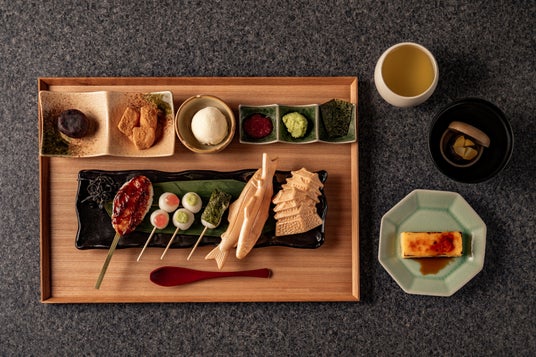 季節ごとに趣向を変えてご提供する『囲炉裏 団子セット』。今秋はお団子に加え、ご自身で握る五平餅づくり体験のほか、ユニークな形の最中など、岐阜を感じていただけるメニューです。