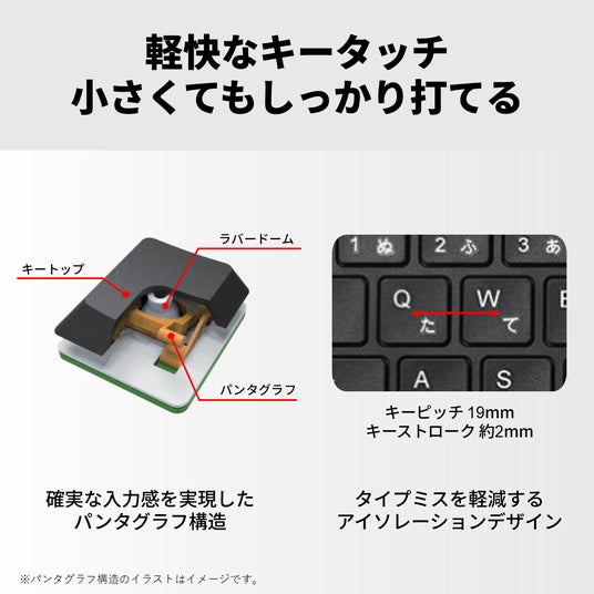 キーはグラつかないパンタグラフ構造を採用しているためまっすぐに押し込むことができ、確実な入力感と軽快なキータッチを実現します。またキー同士の間隔を開けて独立させた「アイソレーションデザイン」を採用しているので、隣り合う複数のキーを同時に押してしまうタイプミスを軽減できます。