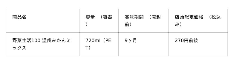 「野菜生活100 温州みかんミックス」は、温州みかんの甘味とほどよい酸味を活かした野菜・果実ミックスジュースです。砂糖不使用で、1日分のビタミンC(コップ1杯 200ml あたり)※を摂ることができ、家族みんなでおいしくお飲みいただけます。また、温めてもおいしく味わえます。パッケージは、寒い中でも感じられる温かみを基調に、みかんのホール剥きをメインにすることで、日本の冬らしい情景を表現しました。