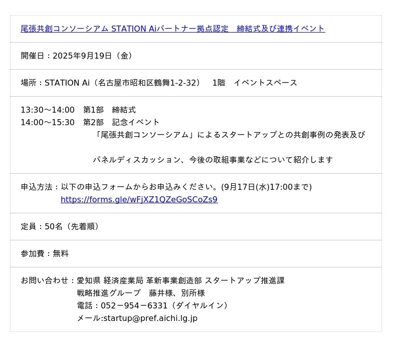 株式会社スカイディスク(本社:福岡県福岡市中央区、代表取締役CEO:内村 安里、以下「スカイディスク」)は、愛知県が開催する「尾張共創コンソーシアム STATION Aiパートナー拠点認定 記念イベント」にパネリストとして登壇します