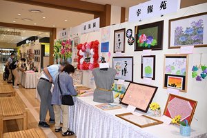 県内の障害者が制作した作品を一堂に集めた「県障がい者ふれあい福祉フェア」が5日、岐阜市正木中のマーサ21で始まった。絵画や手工芸、写真など感性豊かな作品が来場者の目を楽しませている。7日まで。