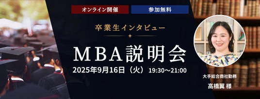 人生100年時代を迎え、キャリアにおける「マルチステージの人生」と「幅広い選択肢」が浸透しています。同時に、テクノロジーの進化により企業活動の可能性や自由度が激変し、組織の力を最大限に生かすマネジメント力やコラボレーション力、経営スキルも重要視されています。この背景から、MBAの学習ニーズが高まり、文部科学省が発表した系統別在籍者数から推定すると、日本では年間約2,500人がMBAを取得しています。この度、当社では、MBA取得をお考えの方あるいはスキルアップを目指す方を対象に、リアルな声を聴ける場として、本イベントを開催いたします。【開催概要】