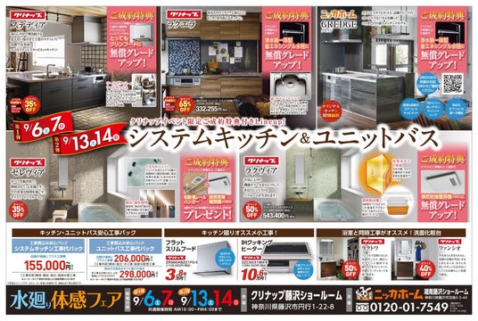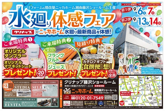 ニッカホーム株式会社(本社:愛知県名古屋市緑区篭山、代表取締役社長:西田裕久、以下 ニッカホーム)の関東支社・ニッカホーム湘南藤沢ショールーム が クリナップ藤沢ショールームにて「水廻り体感フェア」を開催!