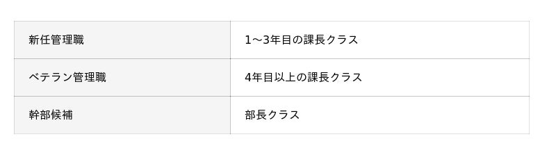 管理職のうち、1~3年目の課長クラスを「新任管理職」、4年目以上の課長クラスを「ベテラン管理職」、部長クラスを「幹部候補」と三つのステージに分類し、ステージ別に違いがあるか見ていきます。