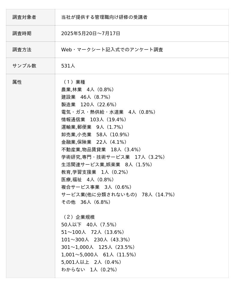 累計20,000社450万人以上の組織開発・人材育成を支援するALL DIFFERENT(オールディファレント)株式会社(所在地:東京都千代田区 代表取締役社長:眞崎大輔)および「人と組織の未来創り(R)」に関する調査・研究を行うラーニングイノベーション総合研究所(R)は、2025年5月20日~7月17日の期間で、管理職531名を対象に「管理職意識調査」を行いました。本リリースでは、回答者のうち課長クラス以上の管理職の理想のリーダー像に焦点を当てた結果を公表します。