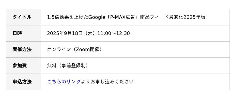 株式会社ファブリカホールディングス(本社:東京都港区、代表取締役社長CEO:谷口政人)の完全子会社、株式会社ファブリカコミュニケーションズ(本社:愛知県名古屋市中区、代表取締役社長CEO:谷口政人、以下「当社」)が提供するEC通販向けCRM・MAツール「アクションリンク」は、Google広告の最新運用セミナー「1.5倍効果を上げたGoogle『P-MAX広告』商品フィード最適化2025年版」をオンライン開催いたします。