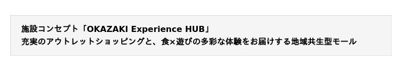 本施設は、157店舗が揃うアウトレットゾーンと、食関連店舗を中心とした23店舗が出店する「OKAZAKI MARKET」から構成されています。両ゾーンを行き来しながらお買い物を楽しめるほか、地域ならではの食を味わえたり、開放的で緑豊かな環境で遊び、憩うなど多様な体験ができる空間となっています。