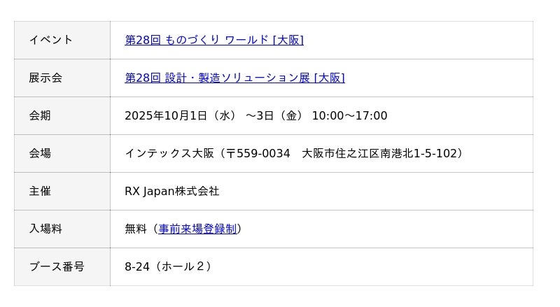 株式会社テクノア(本社:岐阜県岐阜市、代表取締役:山崎 耕治)は、10月1日~3日にインテックス大阪で開催される「第28回 ものづくり ワールド [大阪]」に出展いたします。
