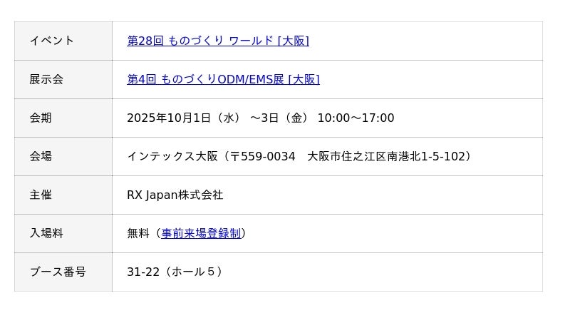 株式会社テクノア(本社:岐阜県岐阜市、代表取締役:山崎 耕治)は、10月1日~3日にインテックス大阪で開催される「第28回 ものづくり ワールド [大阪]」に出展いたします。