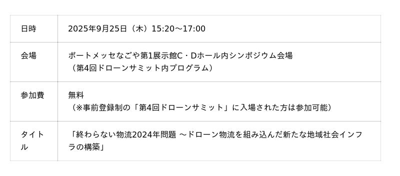 さらに、会期最終日(9月25日)には、本協議会主催で「終わらない物流2024年問題~ドローン物流を組み込んだ新たな地域社会インフラの構築」をテーマに、「新スマート物流シンポジウム」を開催します。