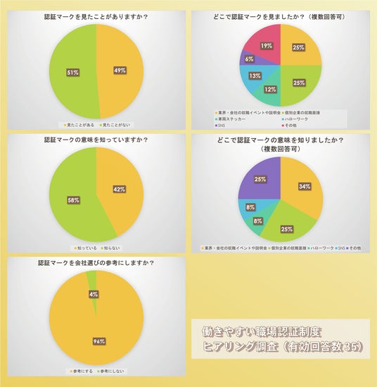 ブースを訪問した35名の求職者に対しては「働きやすい職場認証」に関するヒアリング調査も実施し、「認証マークを見たことがあるか」という質問には約半数が「見たことがある」と回答。「マークの意味を知っているか」という質問にも、「知っている」と回答する求職者が42%に達しました。