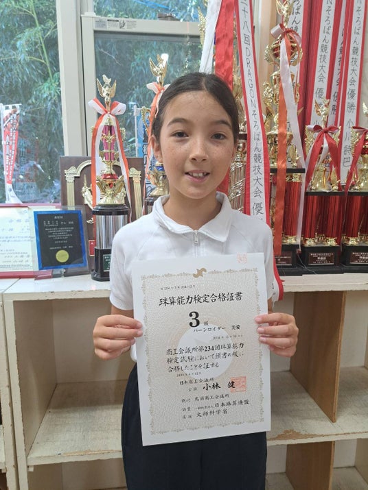 2024年11月末に来日した当時小学4年生のバーン・ロイダー・美愛(ミア)さんは、日本語も九九もほとんど分からない状態から、毎日50分間「両手そろばん」で練習を継続。わずか半年後の2025年6月22日、日商珠算検定3級に挑戦し、ほぼ満点で合格するという成果を収めました。これは両手そろばんの効果を示す大きな実例です。美愛さんは「合格できる自信はあったけど、あと少しで満点という高得点が取れてびっくりした。次は10月にある日商2級に合格したい。オーストラリアに戻っても、そろばんは続けたい」と今もとても意欲的に取り組んでいます。全国珠算教育連盟主催の珠算検定で9月末に1級を受験する予定である。