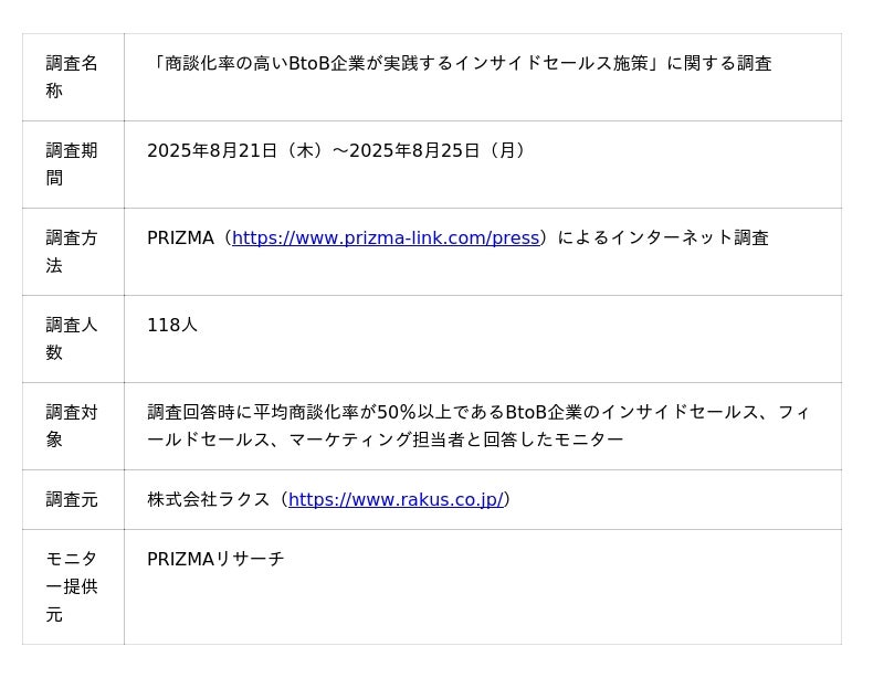 株式会社ラクス(本社所在地:東京都渋谷区、代表取締役:中村 崇則)が提供する商談獲得特化型ツール「配配メールBridge」は、平均商談化率が50%以上であるBtoB企業の担当者を対象に「商談化率の高いBtoB企業が実践するインサイドセールス施策」に関する調査を実施しました。