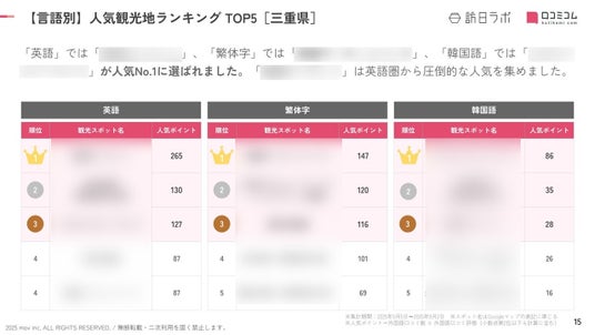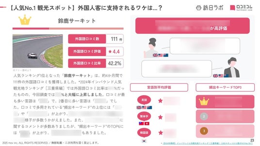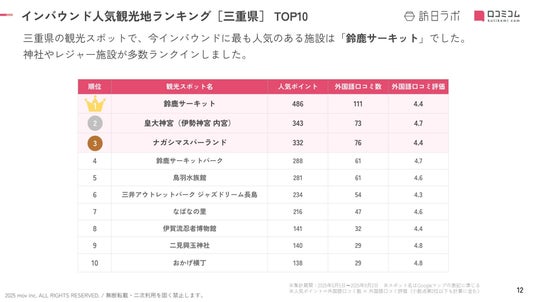 業界最大級のインバウンドビジネスメディア「訪日ラボ」及び 店舗向け集客一元化プラットフォーム「口コミコム」を運営する株式会社mov(代表取締役:渡邊 誠、本社:東京都渋谷区、以下mov)は、三重県の観光地に寄せられた最新の口コミデータから、独自の『インバウンド人気観光地ランキング』を発表しました。