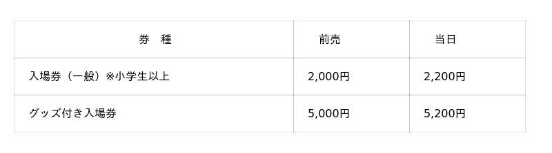 WEBチケット販売 :アソビュー!/ローソンチケット/イープラス店頭チケット販売 :各コンビニエンスストア/会場窓口