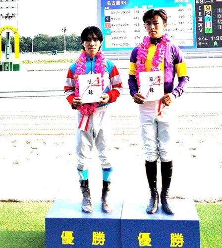 表彰式でYJS優勝ジョッキーとして祝福を受けた松本騎手(左)と西塚騎手