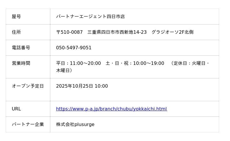 こうしたなか、当社は個社の枠にとらわれずパートナーシップを通じて成婚機会を増大させるためフランチャイズ方式による店舗展開を推進することとし、2024年6月7日にその第1号店として町田店をオープンしました。そして、このたび、新たに株式会社plusurgeと連携し、2025年10月25日に第11号店として四日市店(三重県四日市市)をオープンすることを決定いたしました。