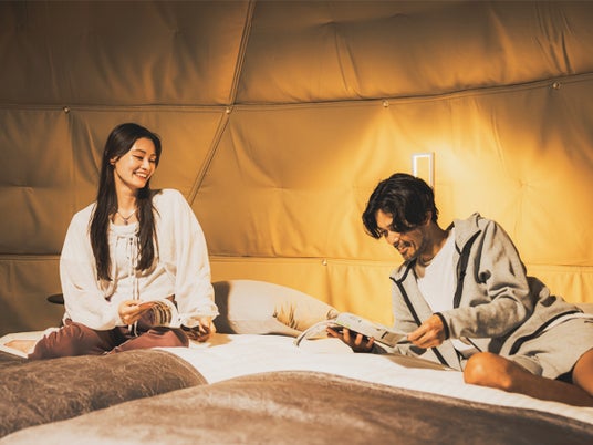 リニューアルにより、グランピング施設のドームテントをテーマ別にデザインし、四季の景色を楽しむ開放的な空間で、ゆったりとした癒しの時間を過ごしていただけます。