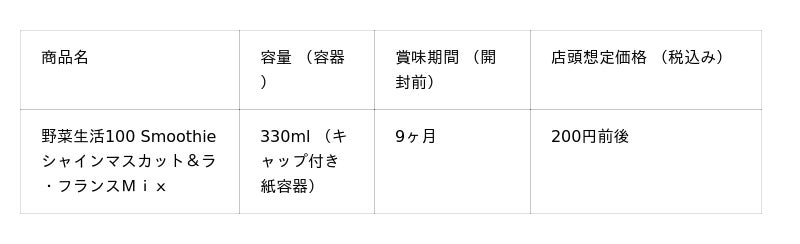 カゴメ株式会社(社長:山口聡、本社:愛知県名古屋市)は、季節限定の「野菜生活100 Smoothieシャインマスカット&ラ・フランスMix」を2025年10月14日(火)から2025年12月末まで期間限定にて全国で発売いたします(在庫がなくなり次第、販売終了)。