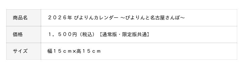 【表面】 名古屋を彩る名所と、「ぴよりんアトリエ」が登場する特別なカレンダー。毎月異なる風景とぴよりんの愛らしい姿を楽しめて、見ているだけで心がほっこり。予定が確認しやすいレイアウトで、実用性もばっちりです。【裏面】 予定やメモを書き込みやすい、広めのスペース。仕事やプライベートの予定管理はもちろん、ちょっとした日記や予定メモにも活用できます。日常のスケジュールをすっきり整理できる、実用的なカレンダーです。