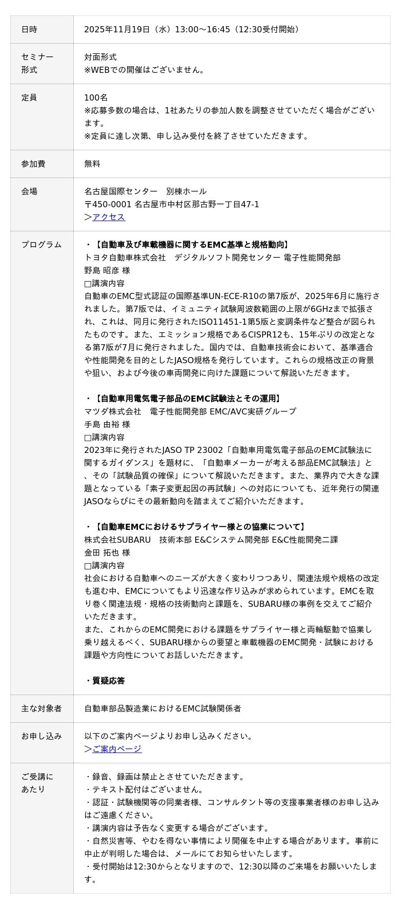 本セミナーでは、自動車メーカーのEMC有識者が、サプライヤーの皆さまへ向けて、今後の『車載機器に求められるEMC性能』について最新の規格動向を交えながら解説いたします。