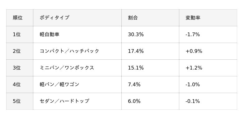 国産車のボディタイプ別ランキングでは、軽自動車が変わらず1位を維持しています。8月は軽自動車が少しシェアを落としているものの、大きな変動は見られませんでした。