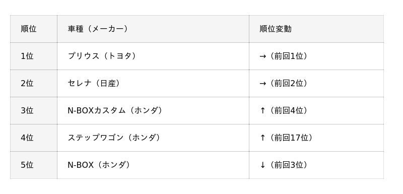 「車選びドットコム」の市場動向から調査した、国産車の2025年8月中古車販売ランキングを紹介します。