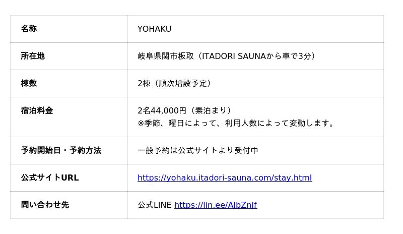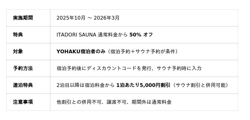 岐阜・板取川のアウトドアサウナ施設 ITADORI SAUNA(運営:株式会社asobiba/代表取締役 三島 陽)は、2025年10月から2026年3月までの期間、YOHAKU宿泊者限定でITADORI SAUNAのサウナ利用料金を半額とする特別キャンペーンを実施いたします。