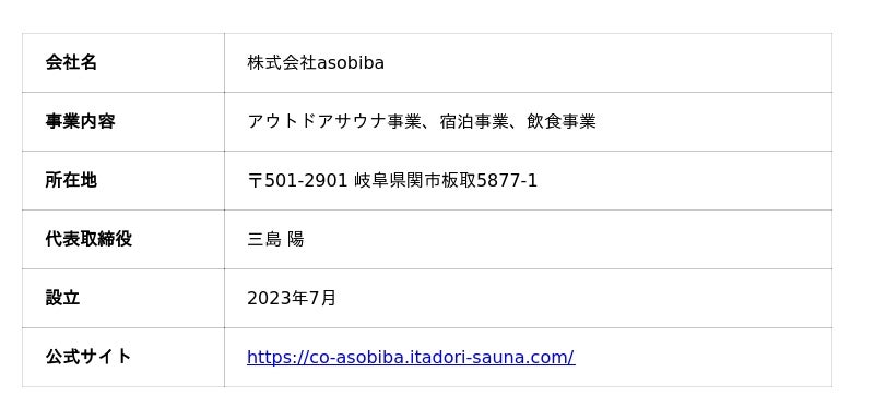株式会社asobibaは、「最高の人生には最幸の休日」をミッションに掲げるアウトドア事業会社です(本社:〒501-2901 岐阜県関市板取5877-1、代表取締役:三島陽、設立:2023年7月)。