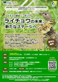 岐阜大の研究者や日本山岳会岐阜支部、日本野鳥の会岐阜でつくる「ぎふライチョウ保全研究会」、県、岐阜大学の主催です。シンポジウムは5日午後1時から午後5時40分で、会場は岐阜大学応用生物科学部101多目的ホール。参加無料で、定員は100人(先着順)。10月3日までに「ぎふ環境学習ポータルサイト」内のフォームなどから申し込めます。