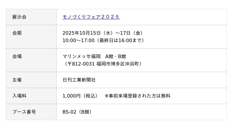 株式会社テクノア(本社:岐阜県岐阜市、代表取締役:山崎 耕治)は、10月15日~17日に マリンメッセ福岡 で開催される「モノづくりフェア2025」に出展いたします。