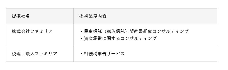 ファミリアグループ(株式会社ファミリア/本社:名古屋市中区、代表取締役:金子英之、以下「ファミリア」)は高齢化が進む社会における認知症による資産凍結や、相続を巡るトラブルへの備えとして関心が高まる「民事信託(家族信託)」ニーズへの対応を強化するため、愛知信用金庫(本店:名古屋市中区錦3丁目15番25号、理事長:本多英明、以下「愛知信用金庫」)と民事信託(家族信託)・相続関連業務に関して、下記のとおり業務提携を行いましたので、お知らせします。