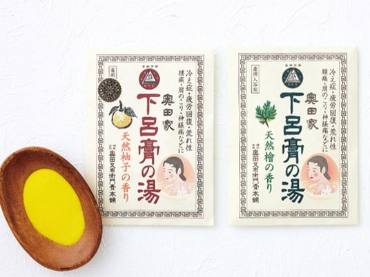 〈奥田又右衛門膏本舗〉(左)下呂膏の湯(柚子)、(右)下呂膏の湯(檜)