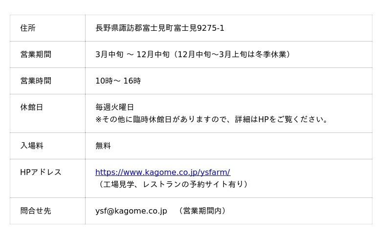 「カゴメ野菜生活ファーム富士見」は、「農業・工業・観光」が一体化した体験型「野菜のテーマパーク」をコンセプトに、2019年4月、八ヶ岳の雄大な自然に囲まれた富士見町に開業しました。最新技術を活用した野菜飲料の工場見学の他、野菜の収穫体験など、 野菜と豊かにふれあいながら、農や食、このエリアの魅力を体験していただくことができる施設です。