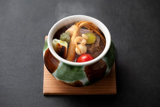 ・飛騨牛と松茸で、深まる季節の味わいを加えた名物の美濃薬膳スープ・信長公の時代には鯛より勝ると言われた魚の洗い 北海道産の帆立やいくらと共に