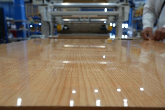 さらに、使用するフィルムを変えることで【鏡面仕上げ】【マット仕上げ】【柄物表現】など、多彩な表面意匠を実現可能です。これにより、建材・家具・内装材などの分野において、デザインの自由度を飛躍的に拡大し、製品価値の向上に大きく寄与します。
