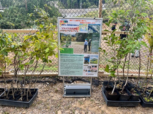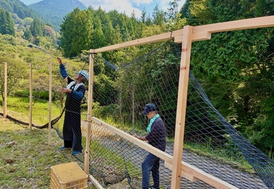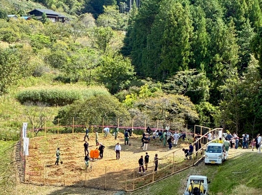 こうした課題に対し、株式会社豊栄工業は、ネット・ロープ・アンカー・結束バンドといった防獣ネット施設の構成資材すべてに生分解性プラスチック原料を採用。高さ2m・長さ約100mの囲い型構造として設置し、2025年9月27日(土)に愛知県北設楽郡設楽町で開催された「どんぐり山大作戦植樹イベント」にて、国内初の実証評価を行いました。