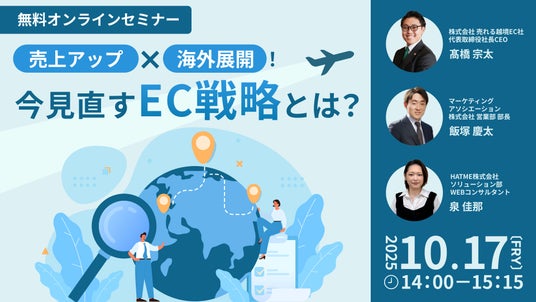 マーケティングアソシエーション株式会社の子会社であるHATME株式会社(本社:東京都台東区 代表取締役:中園広和、以下当社)は2025年10月17日(金)に、株式会社 売れる越境EC社、マーケティングアソシエーション株式会と、3社共催ウェブセミナー「売上アップ×海外展開!今見直すEC戦略とは?」を、開催いたします。