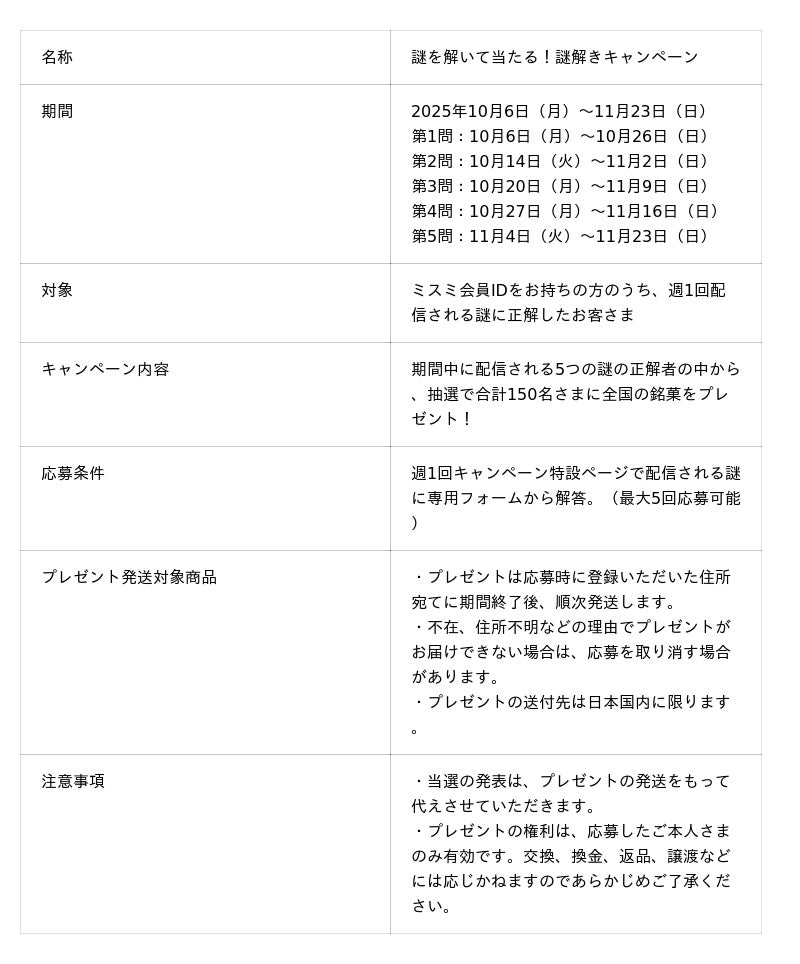 日本最大級の製造業マーケットプレイス「meviy(メビー)マーケットプレイス」(サービス提供元:株式会社ミスミグループ本社)は、2025年10月6日から11月23日までの期間、1周年&利用者1万人突破を記念して2つのキャンペーンを実施します。期間中に配信される謎に正解したお客さまの中から抽選で150名さまに、全国の銘菓をプレゼントします。また、対象商品を25,000円以上購入、かつキャンペーンに応募いただいたお客さま全員に豪華賞品をプレゼントします。