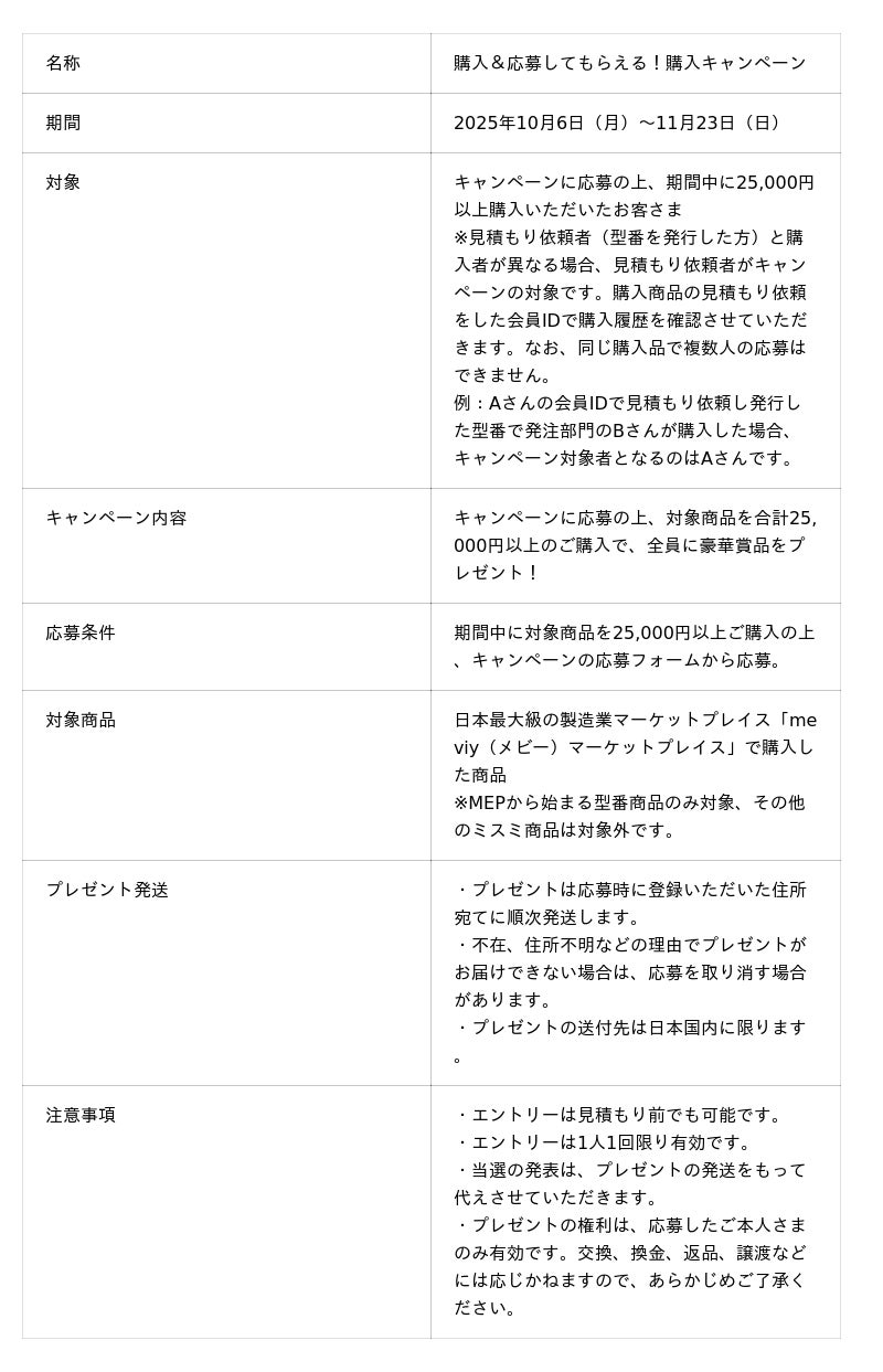 本キャンペーンはこれまでご利用いただいたお客さまへ感謝の気持ちと、初めてmeviyマーケットプレイスをご利用になるお客さまへ、機械部品調達の手間削減による「価値ある時間」を体験いただきたいとの想いから、ものづくりの現場へ創造と笑顔をお届けしたく、企画しました。