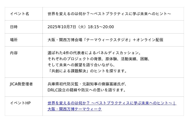 10月7日(火)に万博会場で開催される「ベストプラクティス記念イベント」に、独立行政法人国際協力機構関西センター(JICA関西)が登壇します。