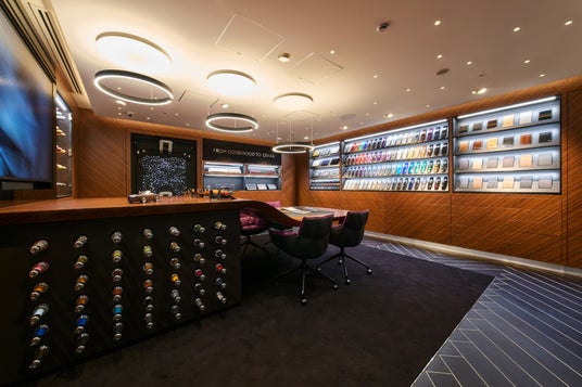 アトリエ (Atelier): 色鮮やかなエクステリアカラー、ウッドパネル、上質なレザー、刺繍糸など、多彩なマテリアルを美しく展示。訪れるお客様が自らの感性を自由に表現できる創造的なインスピレーションを提供します。