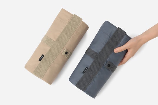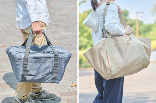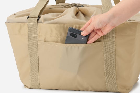 さらに、張りのある生地で型崩れしにくい生地を使用しているので、使わないときはきれいにたたんでコンパクトに収納可能。重さはわずか310g(りんご約1.5個分)と軽量ながら、耐久性にも優れています。外側にはポケット付きで小物の収納ができるのもうれしいポイントです。