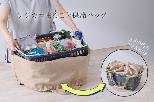 「レジカゴまるごと保冷バッグ」は、スーパーの買い物カゴにぴったり収まるマチ付きの大容量サイズです。レジで商品を直接バスケットに入れてもらえば、そのまま持ち帰ることができ、袋詰めの手間を省けてスマートに買い物ができます。カゴの内側・外側どちらでも使える2WAY仕様で、買い物スタイルに合わせて使い分けが可能です。