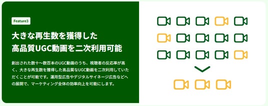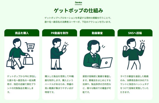 getpop事業のサービスはソーシャルメディアにおけるユーザーの自発的コンテンツを利用した新しい広告手法です。広告主がプロモーションを希望する商材の掲載を行うことでユーザーは自ら購買した商品や体験したサービスの動画を制作・投稿し、表示や再生回数に応じ報酬を受け取ることができます。ユーザー目線の良質で大量のユーザー生成動画が創出されるため企業側も高い宣伝効果が期待できる、消費者を発信者に変える次世代型のプラットフォームです。