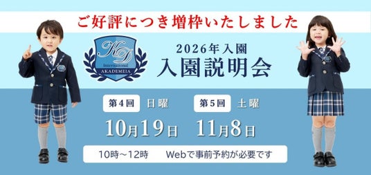 総合教育サービス企業の株式会社やる気スイッチグループ(東京・中央区、代表取締役社長:高橋 直司 以下、やる気スイッチグループ)は2026年4月1日開園予定のバイリンガル幼児園※1「キッズデュオインターナショナル(KDI: Kids Duo International)アカデメイア御成門」(東京・港区)入園希望者向け説明会の参加枠を追加することを発表しました。これまでに実施した説明会は満席となり、多くの反響をいただいたことを受け、10月19日(日)・11月8日(土)の枠を拡大しています。
