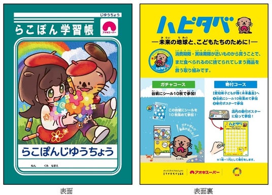 アオキスーパーでは、子ども達が身近に環境問題を意識しつつ、より一層楽しみながら学ぶことができるよう、それぞれの授業のテーマについて分かりやすくまとめた『らこぽん学習帳』を制作し、出前授業で活用しています。
