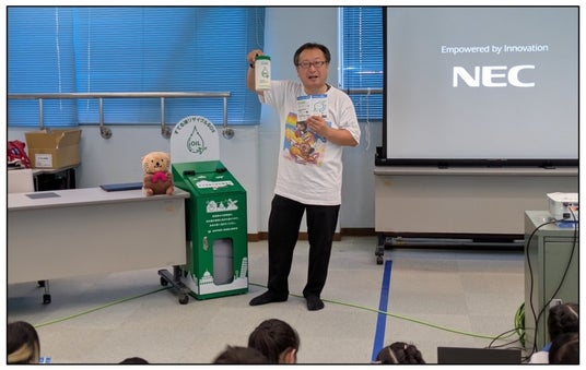 日本航空(JAL)と連携して、お客様のご家庭から出る廃食油(使用済みの油)を店頭で回収して、『SAF(持続可能な航空燃料)』にリサイクルする取り組みについて、専用の回収ボトルや回収 ボックスの実物を用いて、回収(=リサイクル)できる油・できない油やCO2の削減効果等、わかりやすく学べる授業を実施